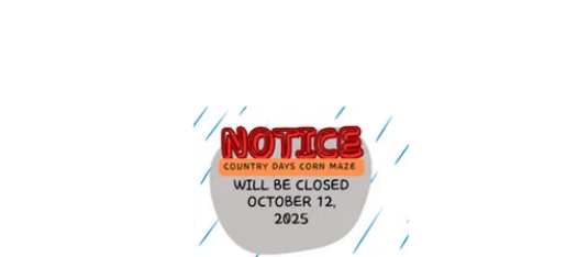Country Days Corn Maze will be closed due to rain on 10/12/25 and resume normal public hourly operations on 10/17/25.